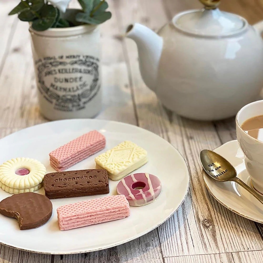 Complete your cake stand with our solid Belgian chocolate biscuit collection. Featuring seven teatime classics—Custard Cream, Bourbon, Party Ring, Jammie Ring, Chocolate Digestive, and Pink Wafers—each handmade from the finest Belgian chocolate for a nostalgic yet luxurious twist on a British favourite.