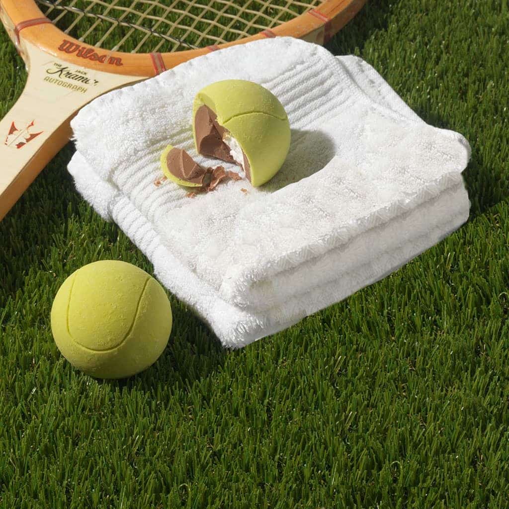 - Tin contains two milk-and-white chocolate tennis balls with marshmallow in the centre