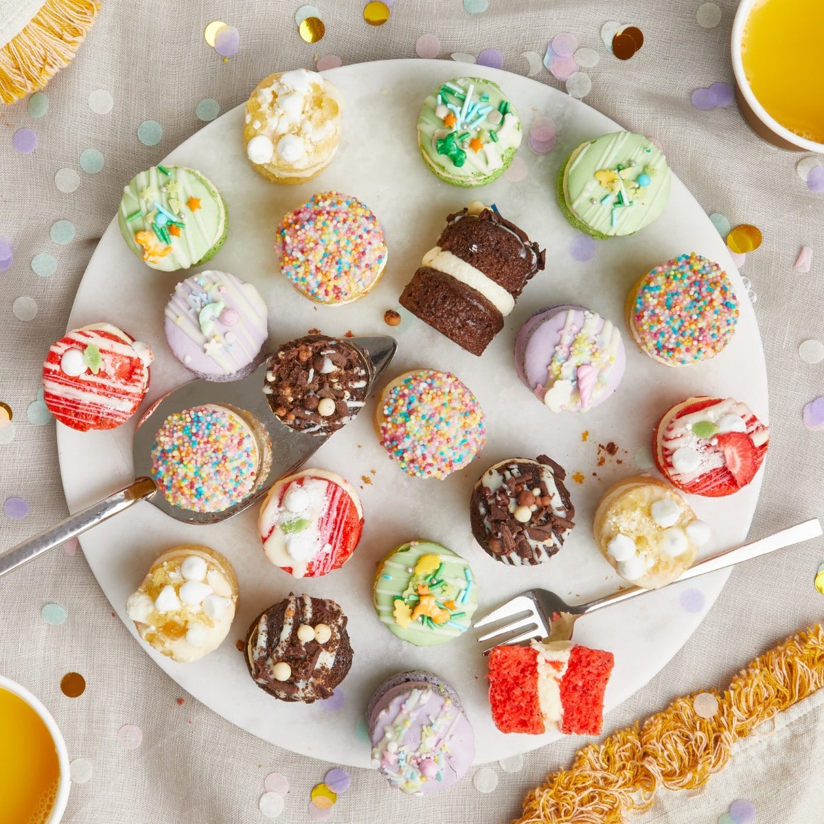 Sugar, Wheat Flour (Wheat Flour, Calcium Carbonate, Iron, Niacin, Thiamin), Pasteurised Free Range Egg, Natural Yogurt (Milk), Rapeseed Oil, Salted Butter (Milk, Salt), Whole Milk, White Chocolate Topping (Sugar, Fully Hydrogenated Vegetable Fat (Palm Kernel), Skimmed Milk Powder, Lactose (Milk), Emulsifier (Sunflower Lecithin), Flavouring (Vanillin)), Confetti Sprinkles (Sugar, Potato Starch, Sunflower Oil, Rice Flour, Colours (Carmine, Curcumin, Patent Blue V)), Humectant (Vegetable Glycerine), Raising Agents (Disodium Diphosphate, Sodium Hydrogen Carbonate), Wheat Starch, Cornflour, Colour (Tartrazine), Natural Flavouring.